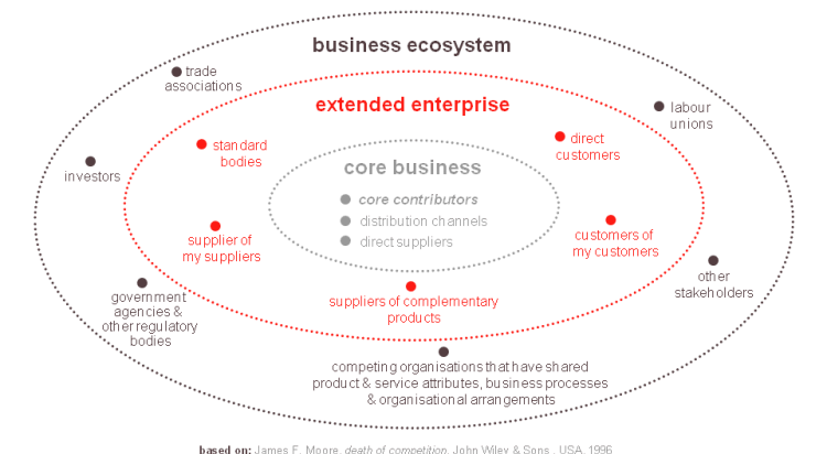 “در یک اکوسیستم کسبوکار شرکتها حول یک نوآوری جدید مسیر تکامل مشترک را طی مینمایند؛ با همکاری مشترک و رقابتی بدنبال پشتیبانی از محصولات جدید و تامین نیازهای مشتریان میباشند”.
